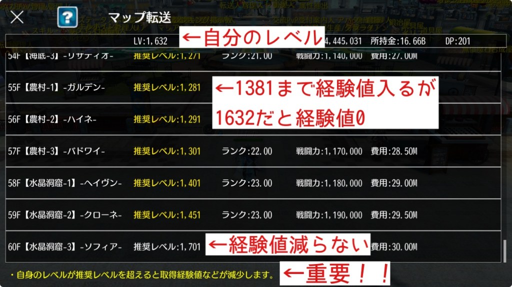 マップ転送する時の画面に推奨レベルの項目があるので、この文字が黄色いと獲得経験値の低下措置が入ります。低下措置は推奨レベルから離れるほど取得経験値が下がる仕組みで、最終的に貰える経験値は0になります(最終階層60階はLv1705以上だと取得経験値が段階的に下がります)